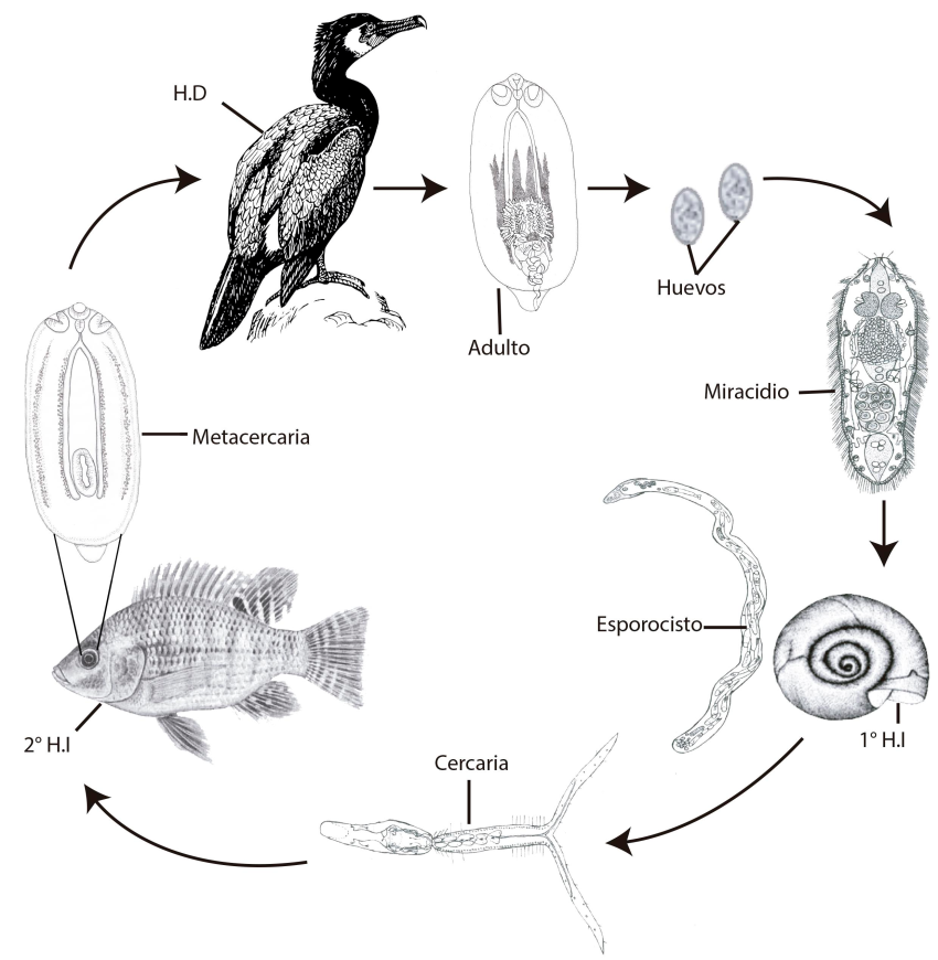 Ciclo de vida de un tipo de helminto, el trematodo. H.D. = Hospedero definitivo (cormorán); 1 HD = primer hospedero intermediario (caracol); 2 H.I = segundo hospedero intermediario (pez).
