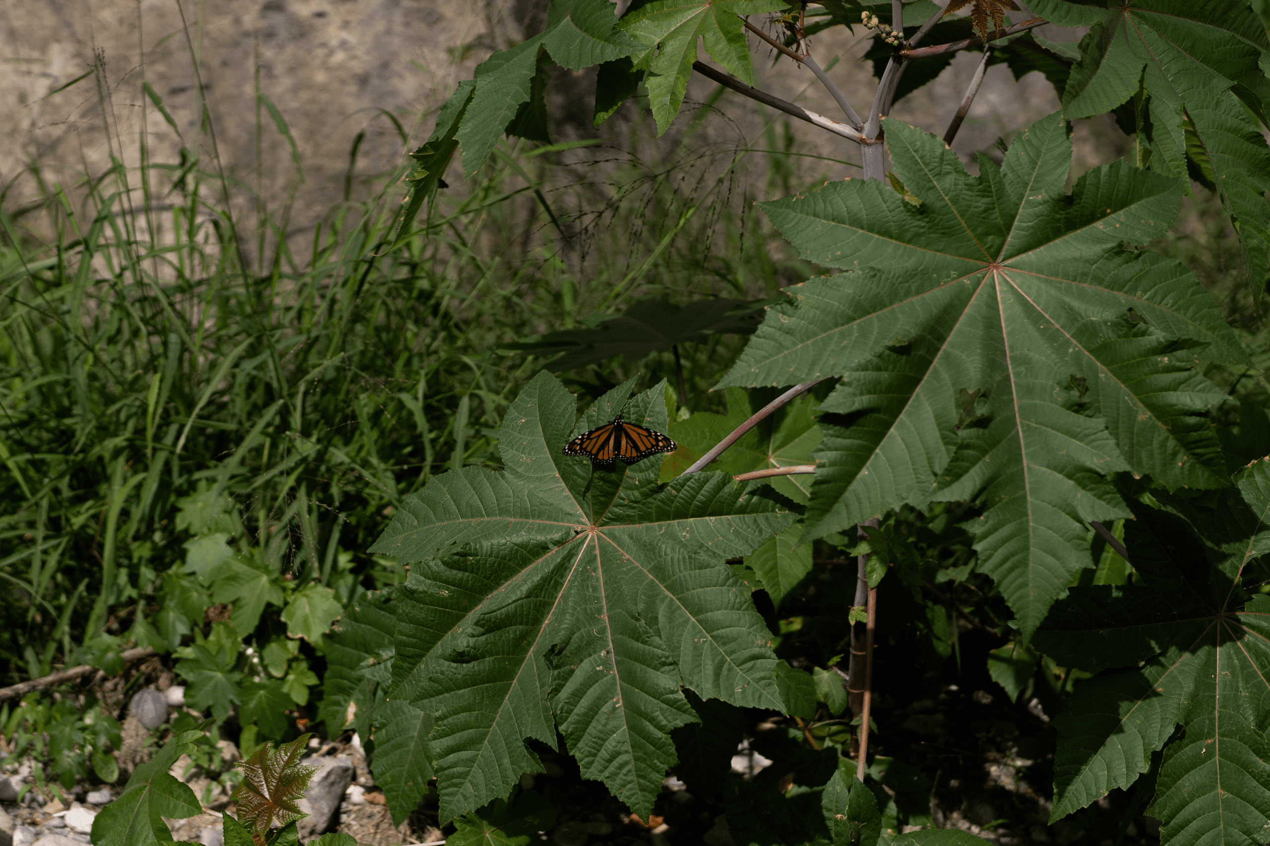 Mariposa Monarca en el Río Santa Catarina descansando en la hoja de un Ricino