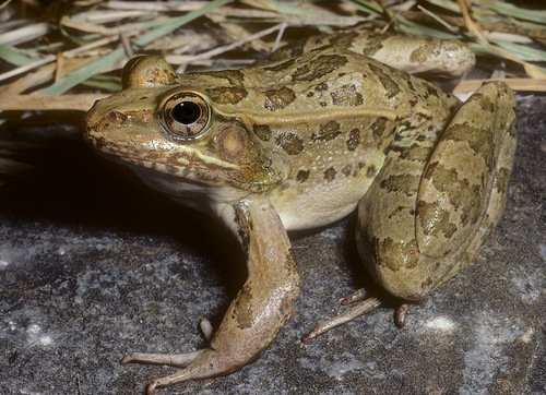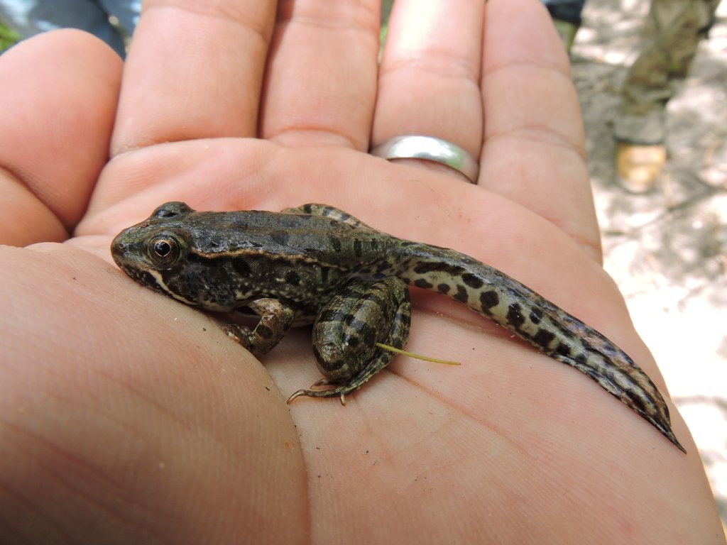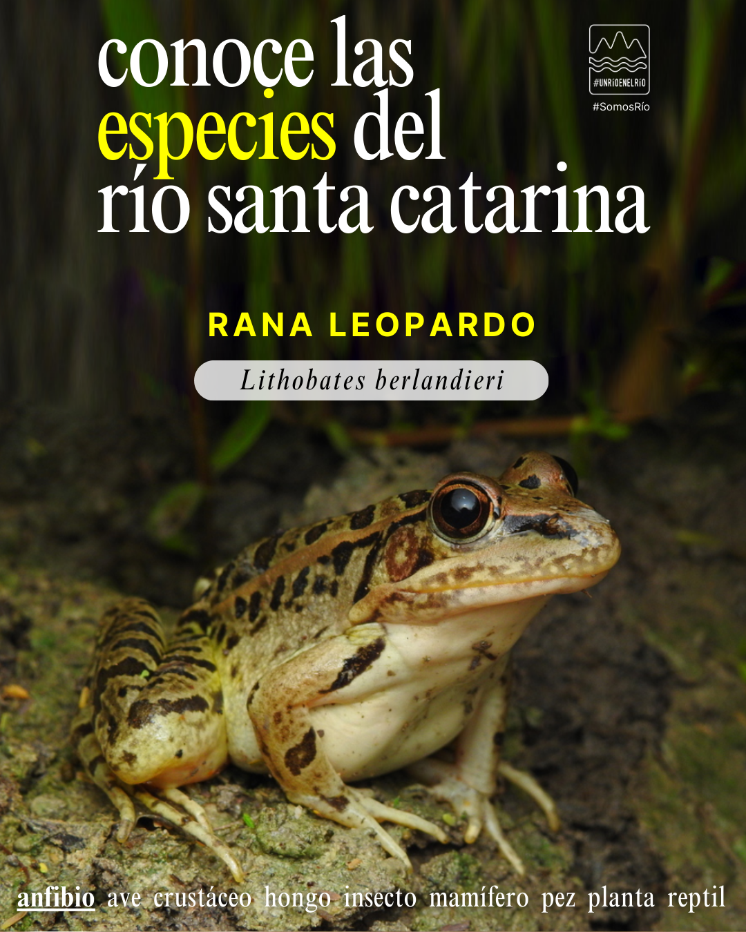 La rana leopardo, es un anfibio anuro (ranas y sapos) de costumbres acuáticas (que se asocia a cuerpos de agua como ríos, estanques o arroyos). Es una rana grande con un promedio de 64 – 80 mm de longitud de hocico a cloaca en adulto.